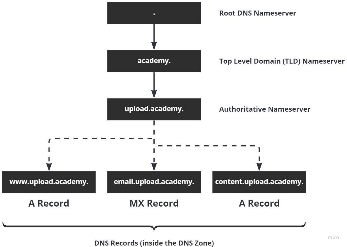 The root of the entire address is at the right side and .. Following this (going right-to-left, remember) is the Top Level Domain (TLD), academy. Now we have the second-level domain, upload, which gives us upload.academy. Finally we get the Authoritative Nameserver at upload.academy. which contains all the DNS records.