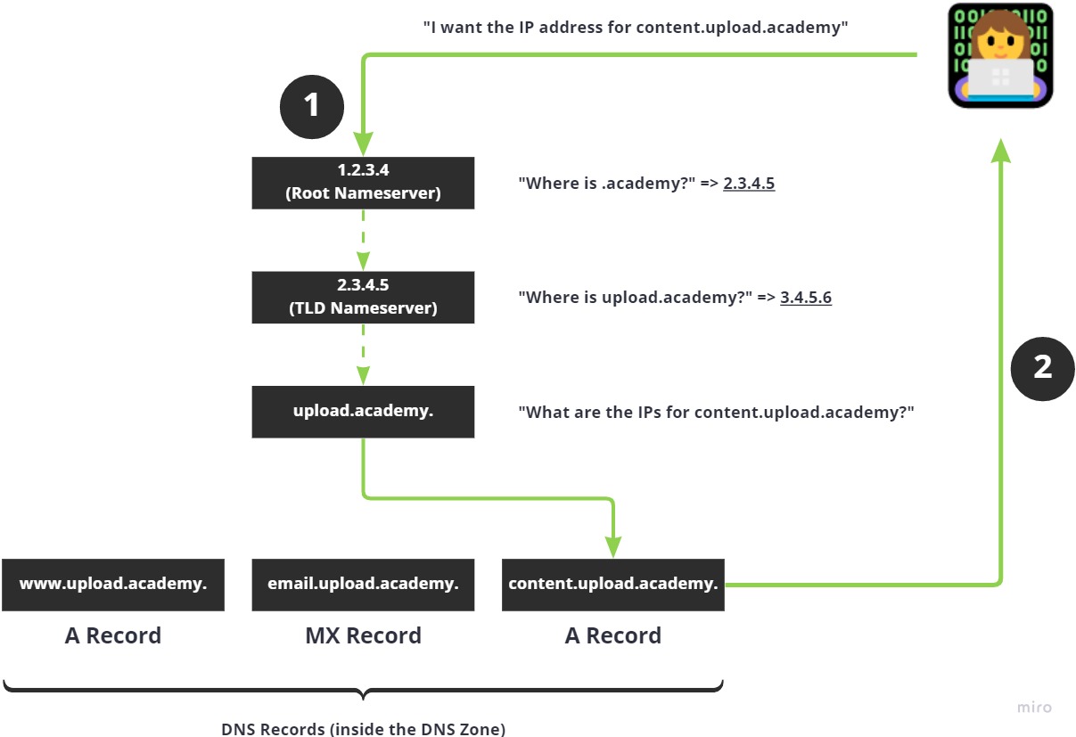 upload.academyand does not find it - Your computer then goes to the root DNS nameserver and asks it, "Where can I find information on