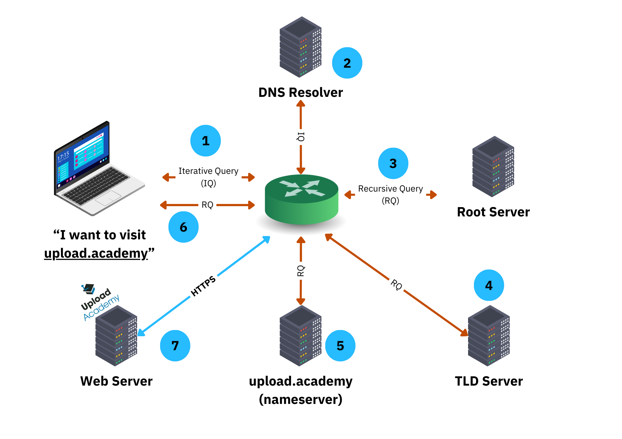 upload.academy.(note the.at the right-hand-side [RHS]); - The response from the DNS Resolver points to the Root Server;