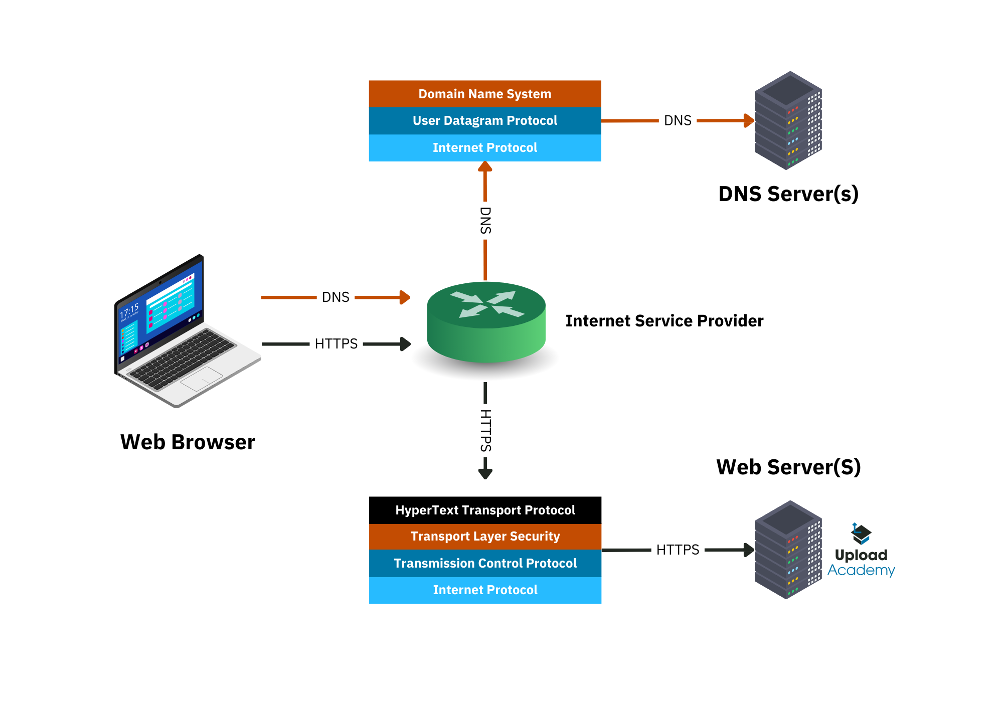Before you can send a request for the website you want, your browser has to use DNS so that it can translate upload.academy into its IP address, such as 1.2.3.4 (that's not the real IP for upload.academy, it's just an example.) DNS is how we're able to use human readable names for our websites, like upload.academy or duckduckgo.com, and not 67.78.89.12 or 123.45.67.67 (or whatever.) We don't remember numbers like that very well, especially when you consider the amount of websites and services we now all use on a daily basis.